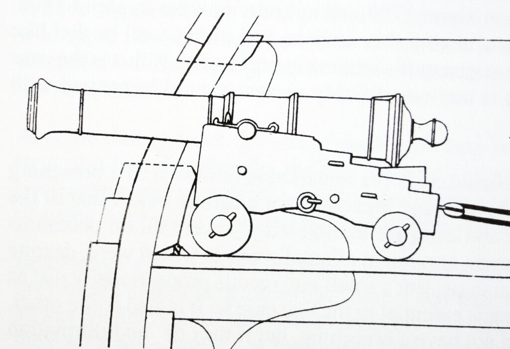 This gun would originally have been on the quarter deck of the ship. Notice that the gun now lies upside down with the iron fastening bolts of the wooden gun carriage still attached to the gun. It is 2.35m (7ft 6 in) long and weighs over a tonne.