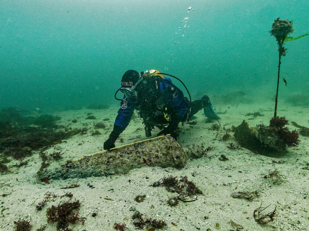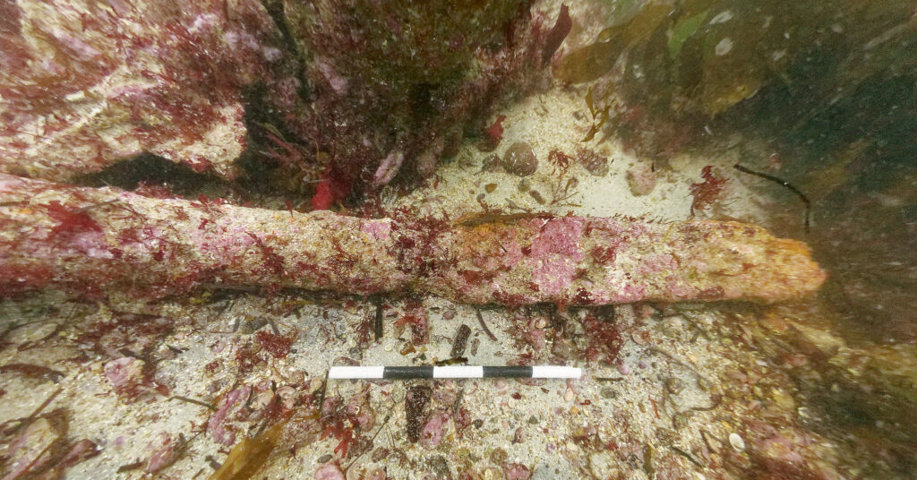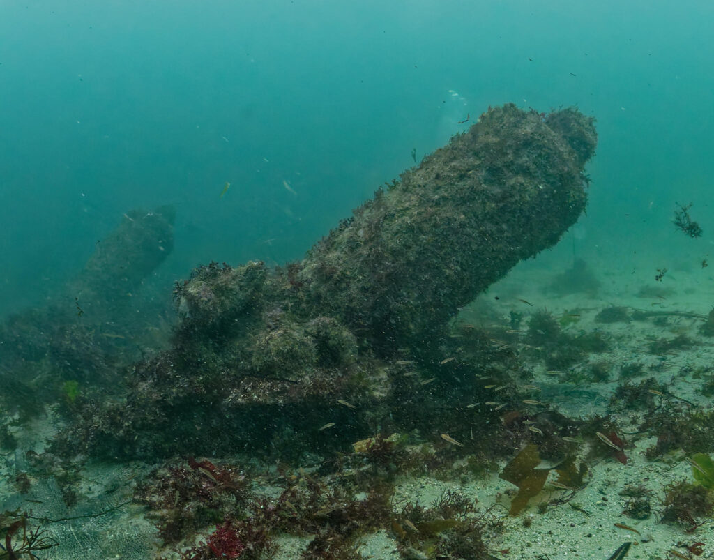 The wreck lies on its port side and what you will see are the inside timbers of the ship’s hull. There are also nine of the cannons which formed part of the ship’s armament to be seen on the diver trail. Take time to look closely at the seabed. We have deliberately left many objects from the wreck in place on the seabed for visiting divers to discover and inspect. But please leave them in place for others to enjoy.