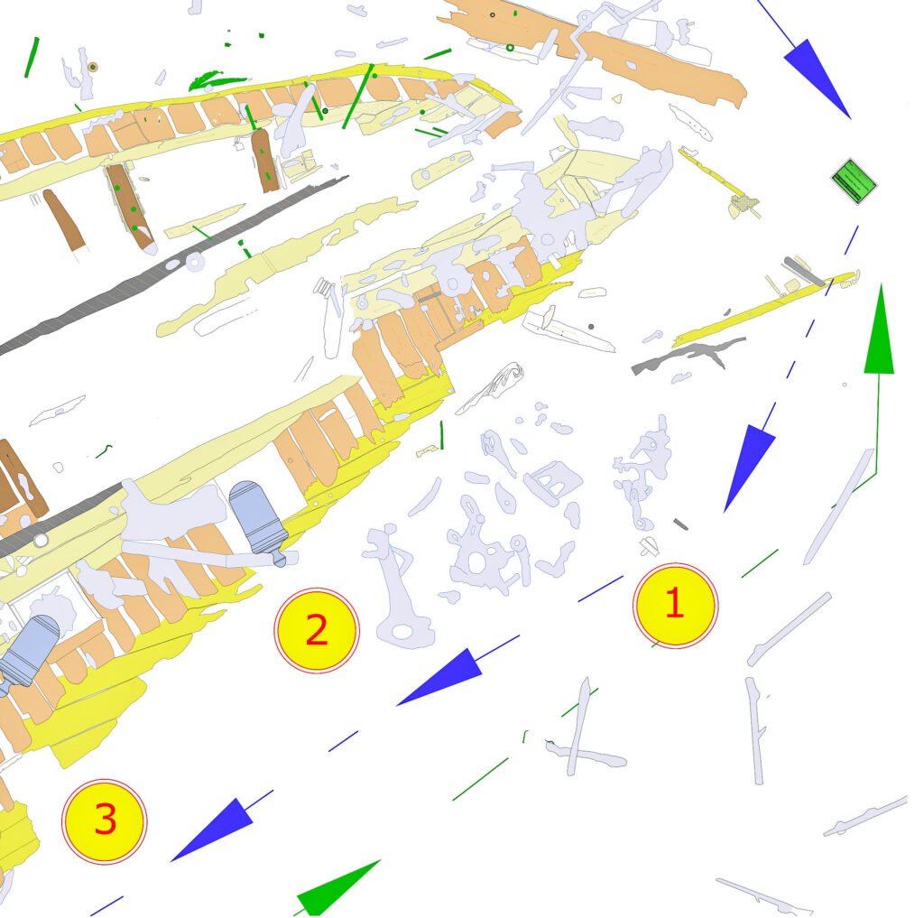 Follow the bottom line to the north west and you will arrive at dive station 5 on the main wreck site (Blue Route). Follow the trail to the seabed sign where you started, and from there back to the shot line you originally descended.