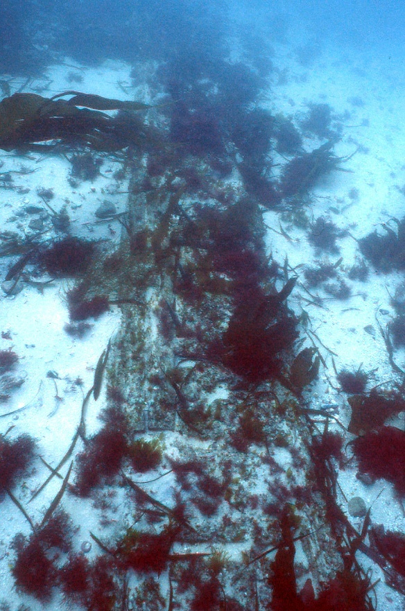 You can now see a number of copper spikes standing upright on the seabed. These are the remains of the copper bolts used to fasten the timbers of the hull. Before 1780 ships were fastened using iron bolts.