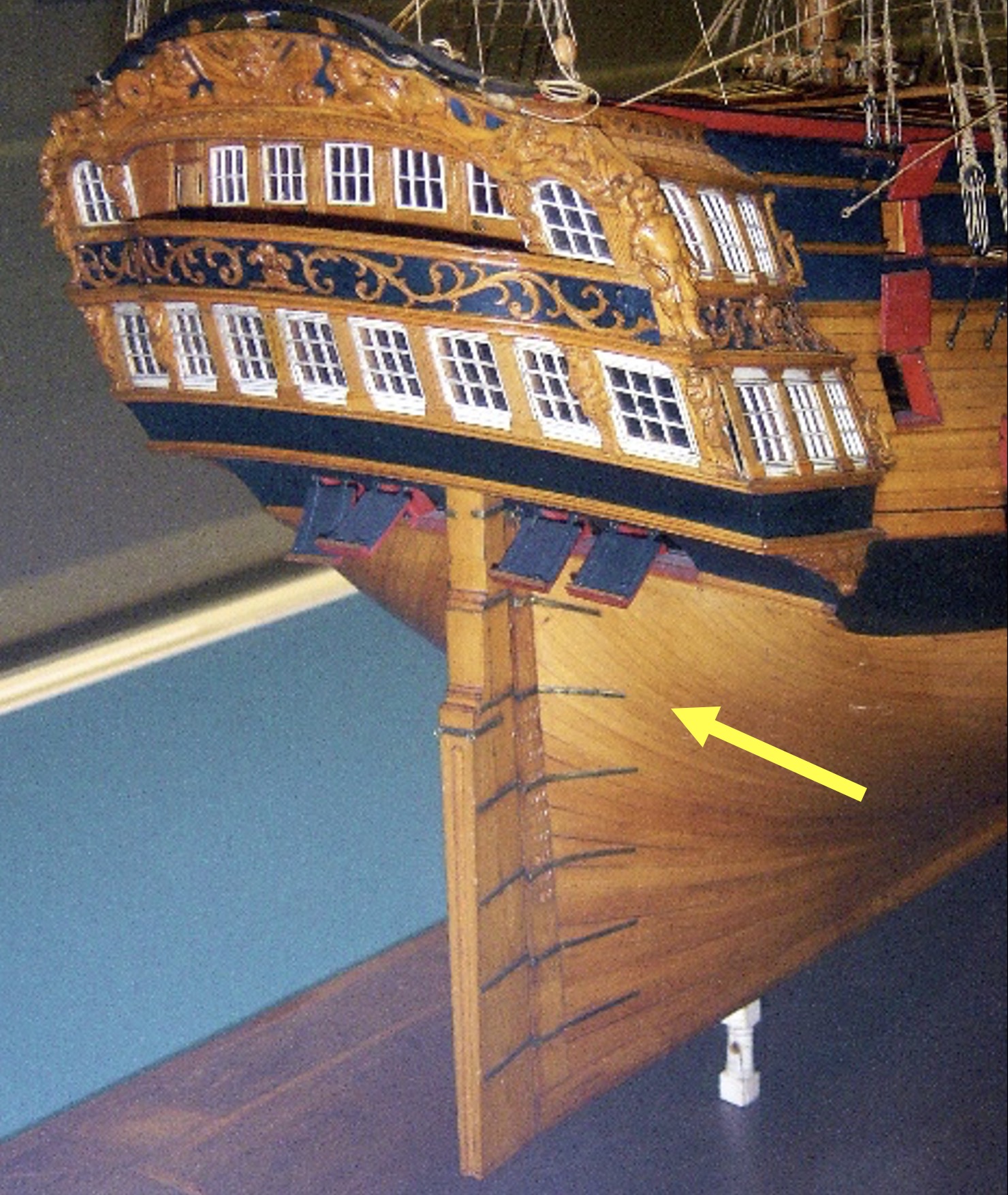 Turn so that you are facing south. In front of you are the timbers of the hull. You should also be able to see several copper fastening bolts similar to those you saw at the last station. At the outside of the hull (outer planking) you should be able to see some of the copper sheathing which covered the hull below the water line.