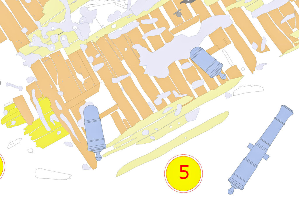 Turn to face north. In front of you now is one of the five eighteen-pound iron guns standing upright on the seabed, their muzzles buried in the sand. If you look carefully, you will see that the guns are still within their gun ports. Immediately in front of you there is timber exposed on the seabed. This is the inside face of the ship. You will also see an empty gun port very close to station 3. This is one of the quarter deck gun ports, where smaller nine-pound guns would have been.