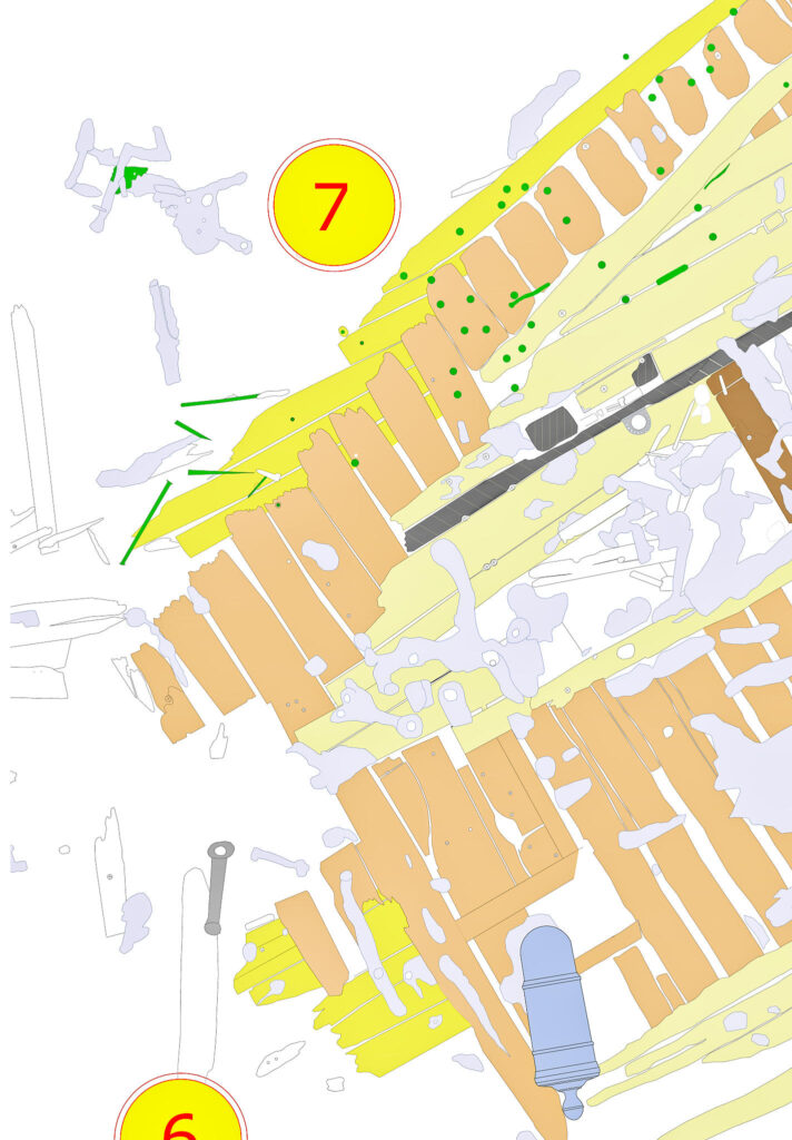 At station 5 you can see one of the eighteen-pound guns lying flat on the seabed. This gun is probably the one which was originally sited at the empty gun port you saw at station 4. Here you can see just how large these guns are. They are 2.75m (9 ft) long and weigh almost two tonnes each. The lower deck guns (thirtytwo-pound) were even larger. We do not know why this gun did not remain within its gunport as the other five eighteen-pounders did.