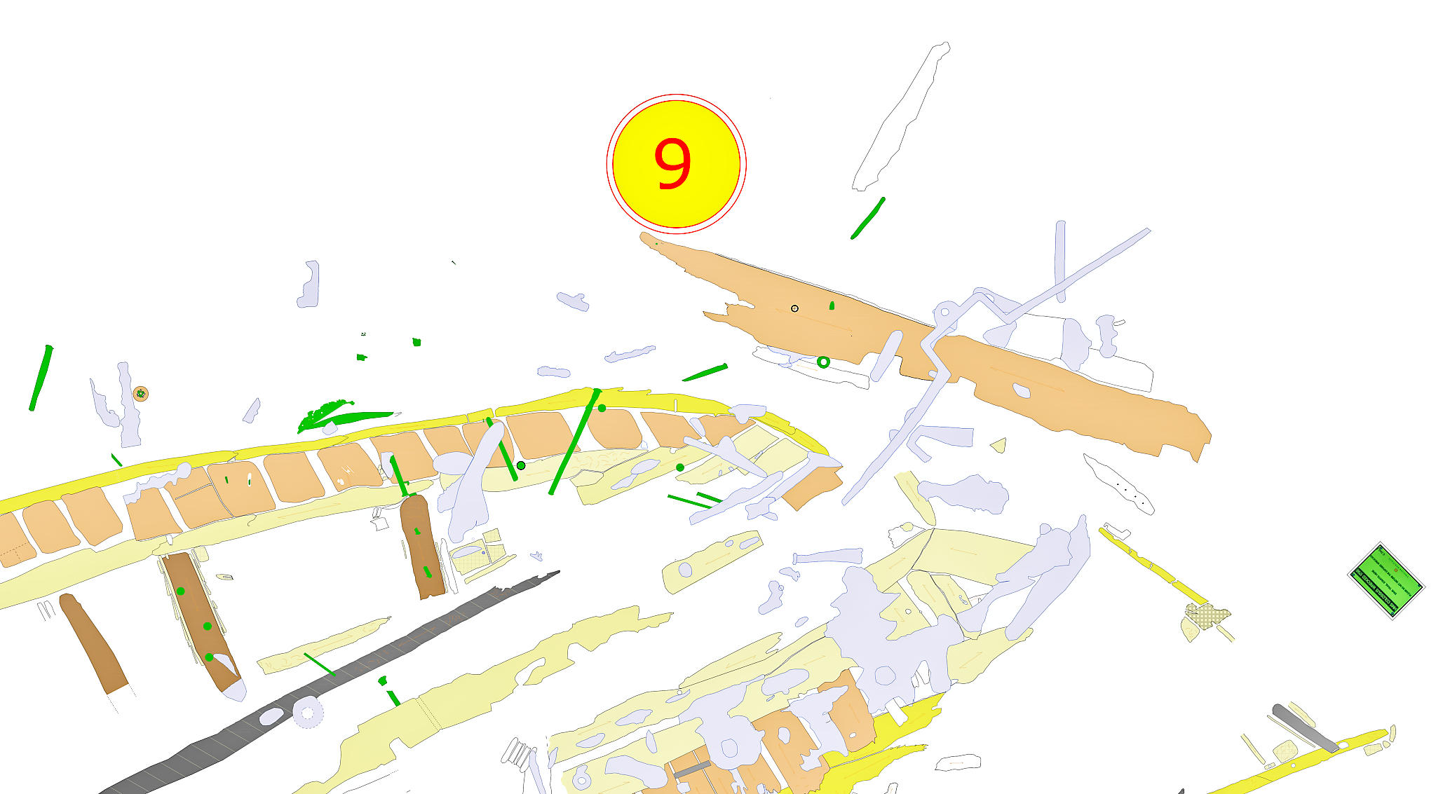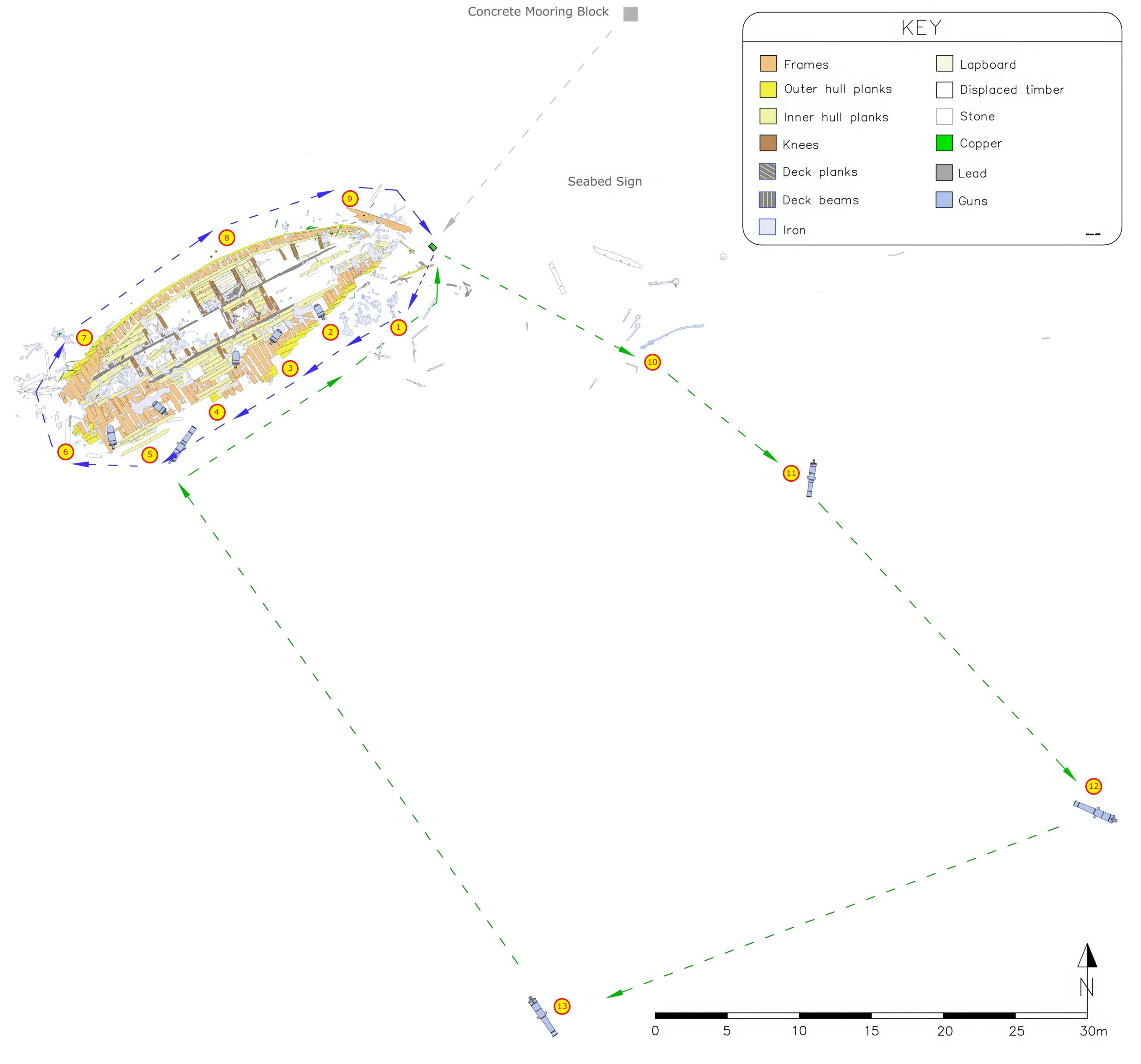 Follow the bottom line to the north west and you will arrive at dive station 5 on the main wreck site (Blue Route). Follow the trail to the seabed sign where you started, and from there back to the shot line you originally descended.