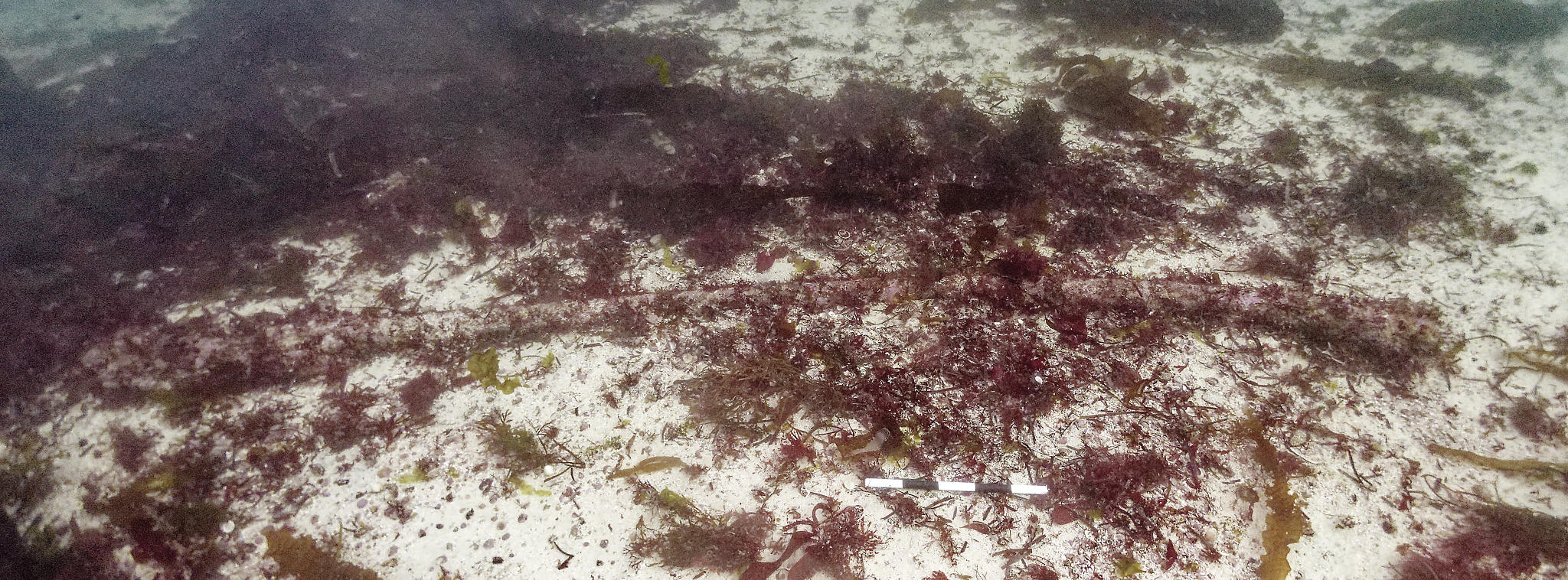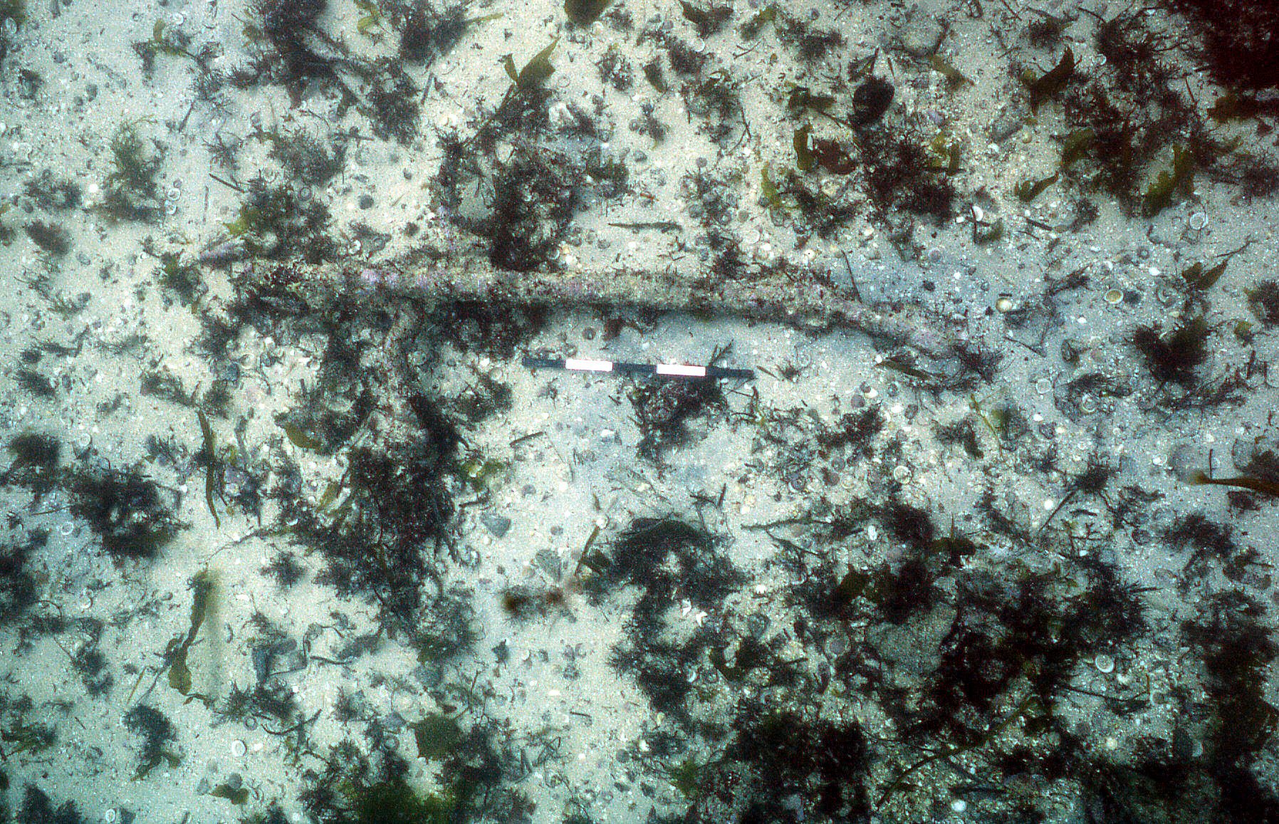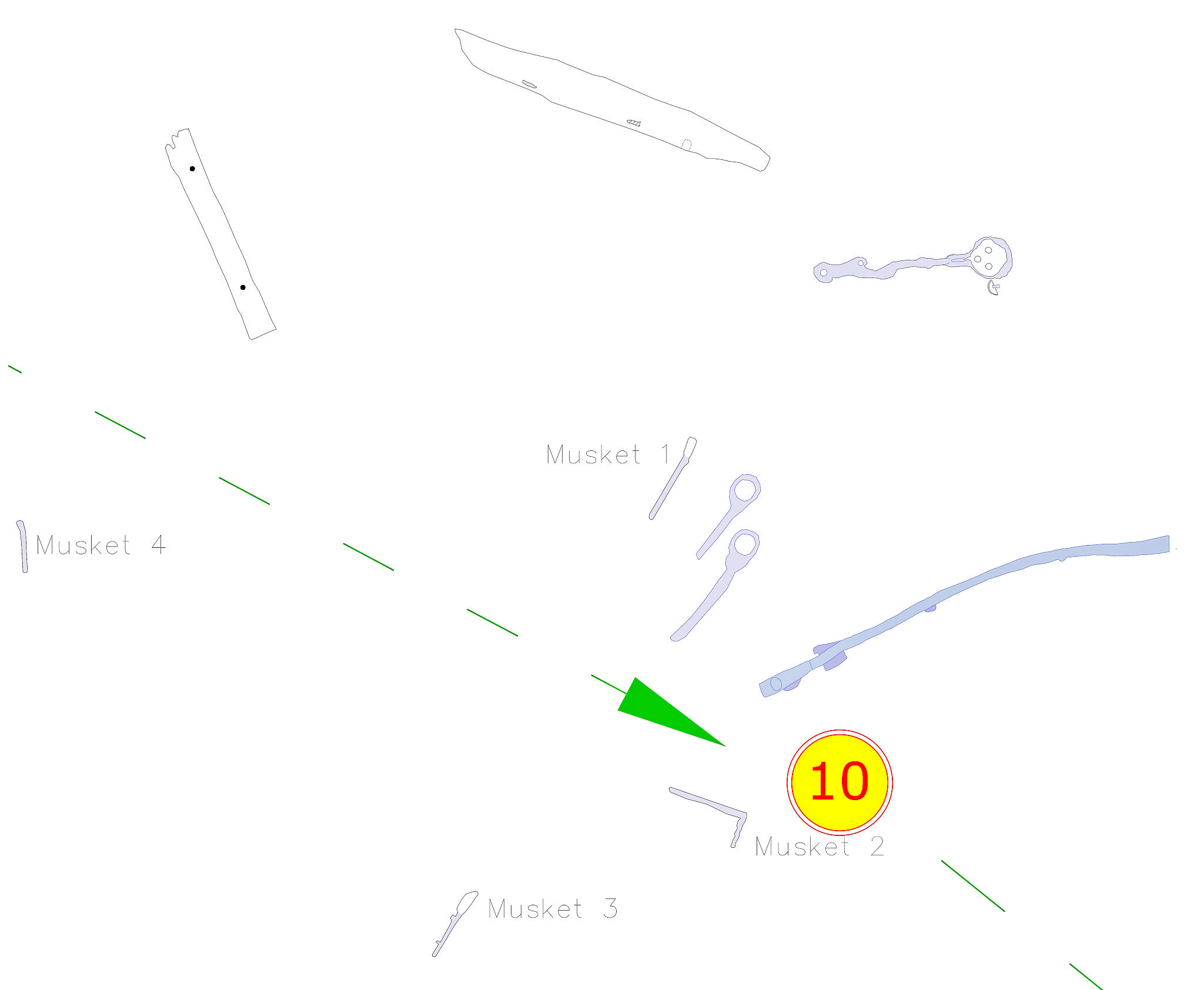 If you look to the west of the iron spar you will see three more muskets exposed on the seabed. These are sea-service muskets just like those you saw at station 2. These muskets became exposed by falling seabed levels in 2014.