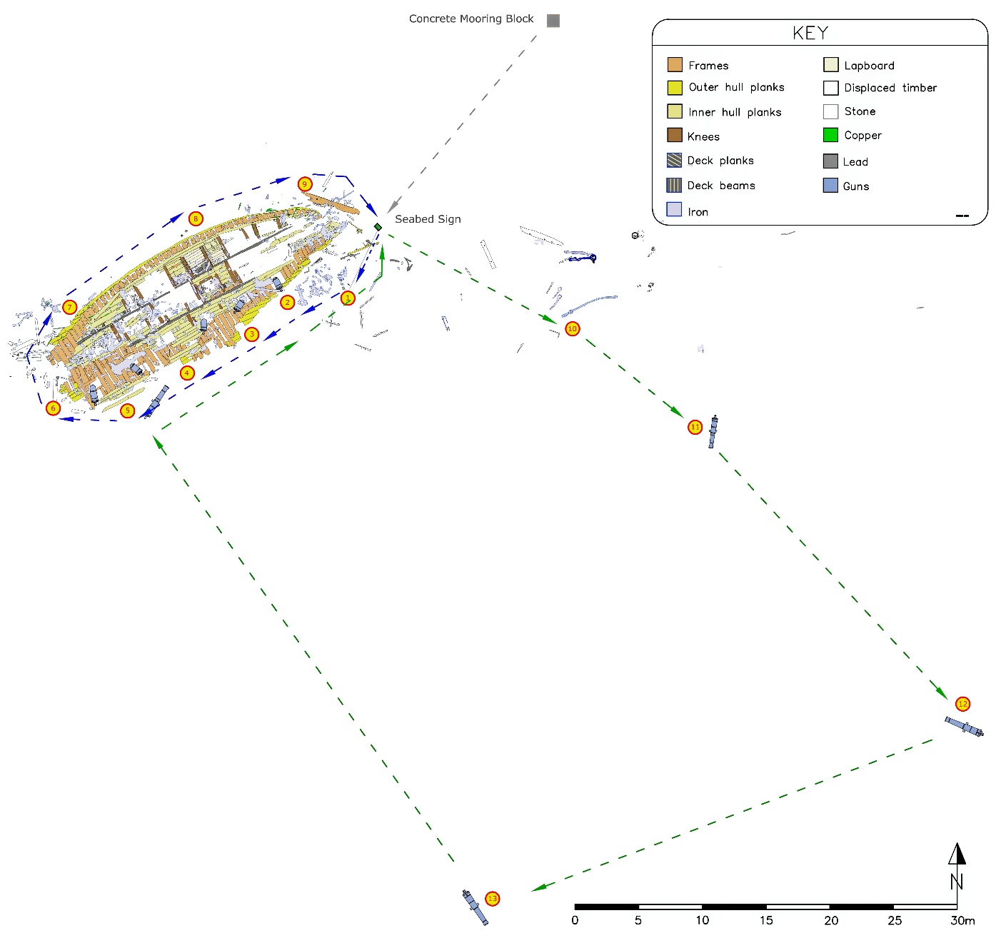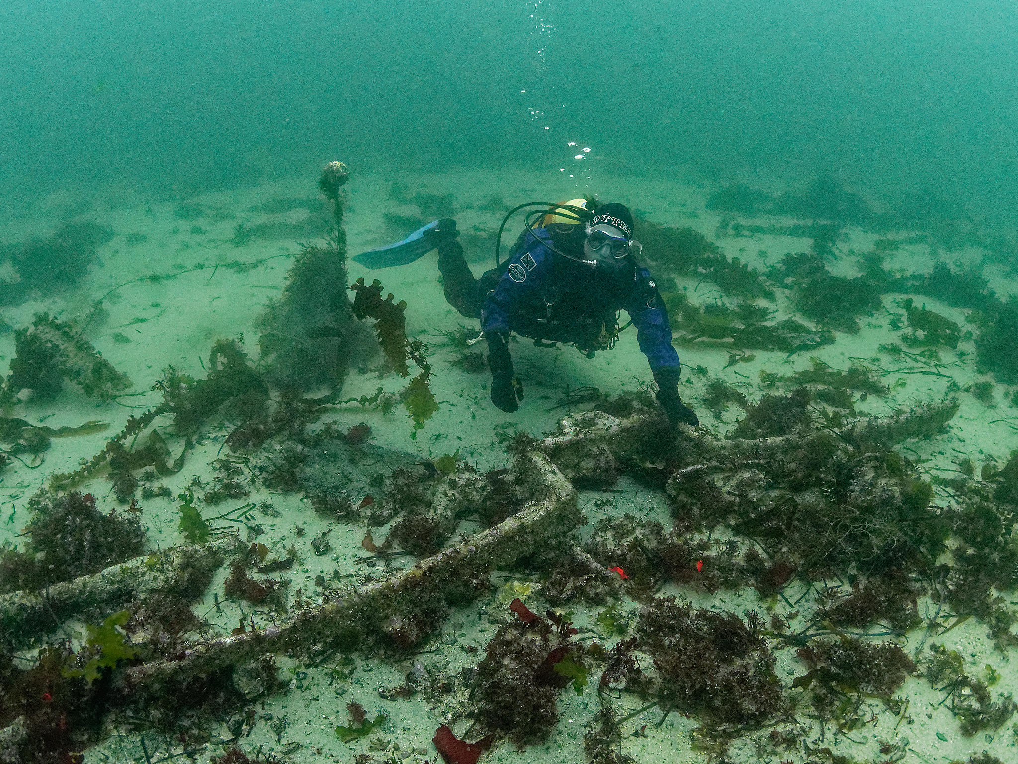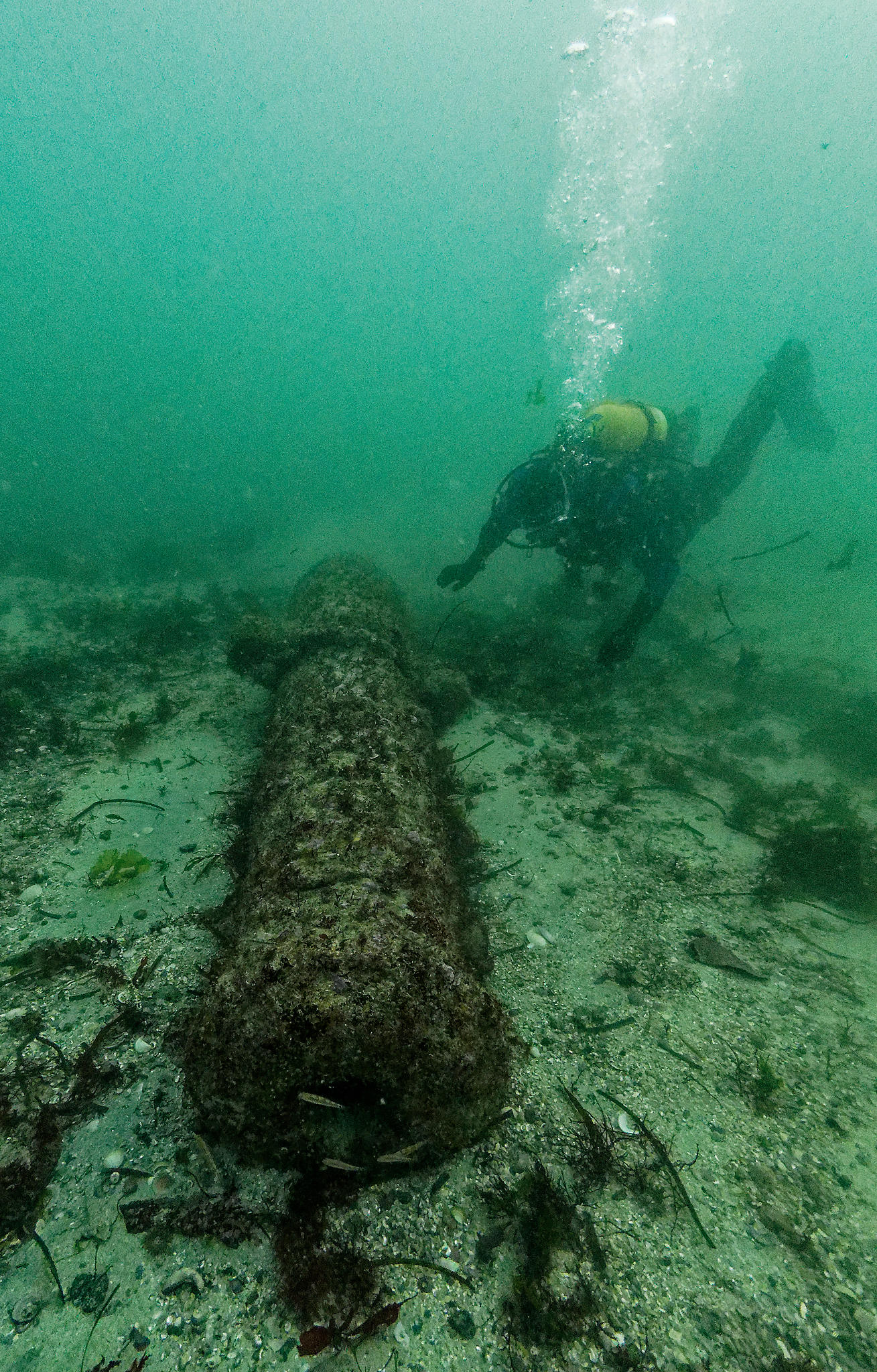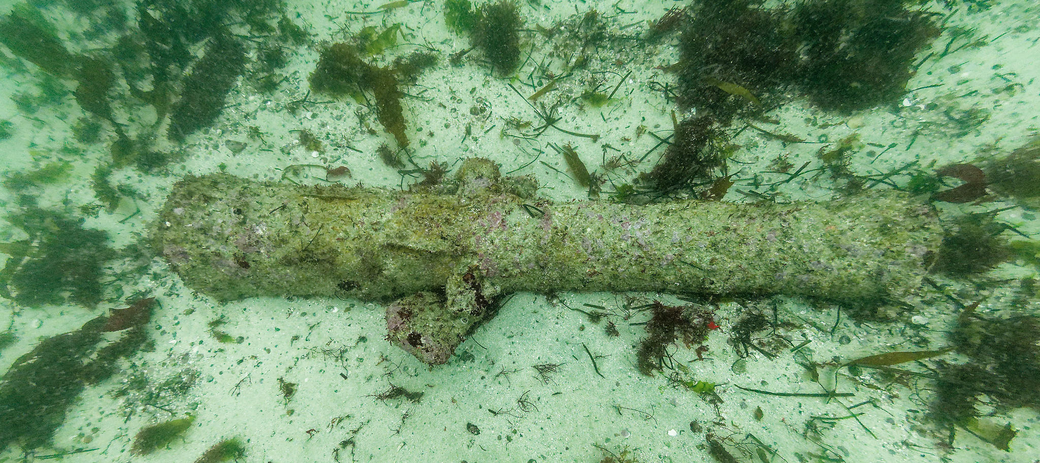 The wreck lies on its port side and what you will see are the inside timbers of the ship’s hull. There are also nine of the cannons which formed part of the ship’s armament to be seen on the diver trail. Take time to look closely at the seabed. We have deliberately left many objects from the wreck in place on the seabed for visiting divers to discover and inspect. But please leave them in place for others to enjoy.