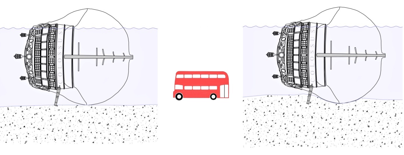 These sketches explain how the guns came to be standing upright on the seabed. On the left is a schematic section of the hull after it turned over, as the upper deck guns crashed through their gunports and came to rest on the seabed, held upright by the gunports. On the right is the same view but after sediment had accumulated under the hull, trapping the muzzles of the guns. The London bus is shown to give an idea of the scale.If you look at the seabed below the gun you will see a long, slightly bent bar of iron. We did not know what this was until in 2024 we removed all the weed from this bar and it became apparent that it was in fact the shank of a broken iron anchor.