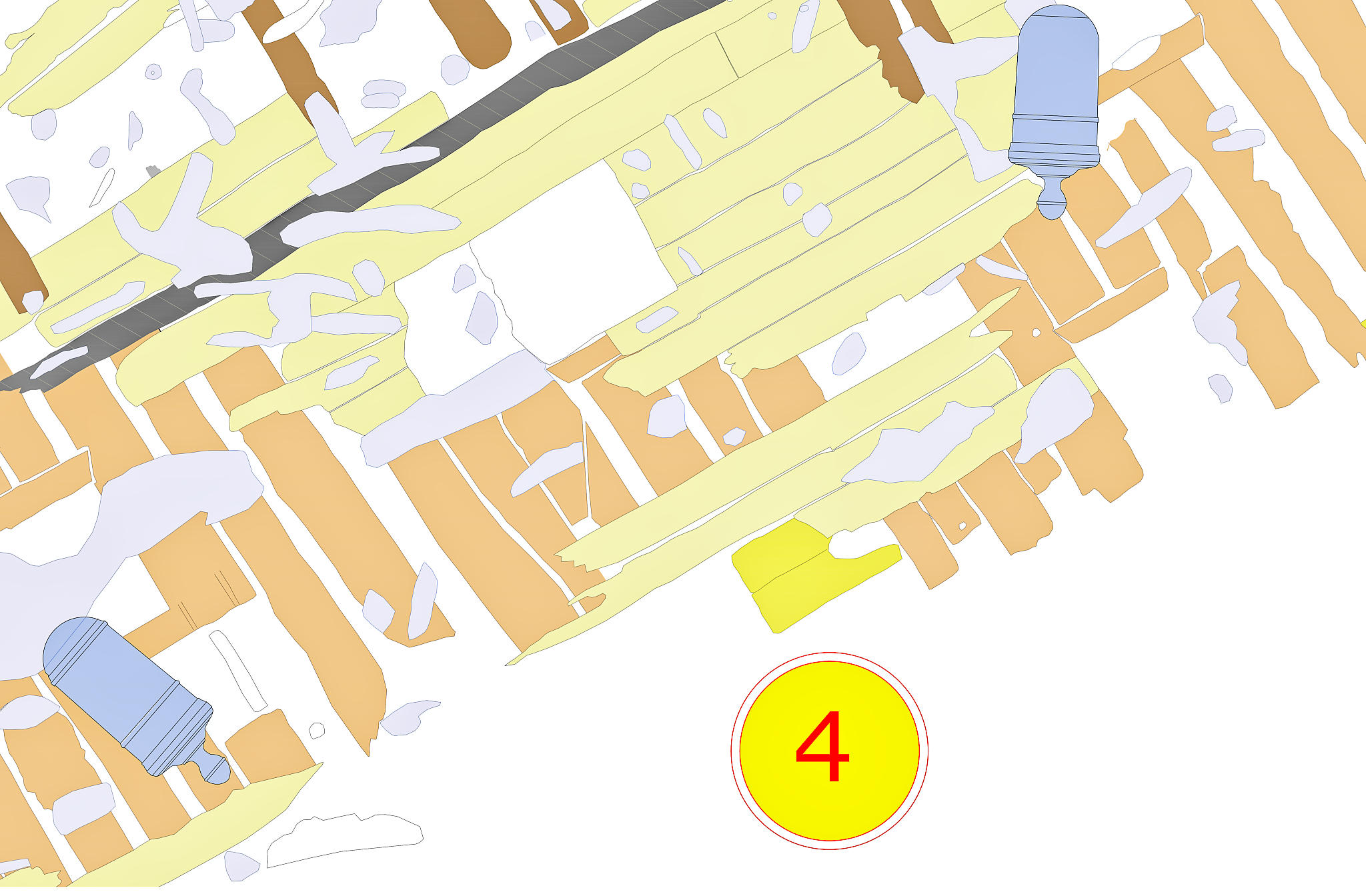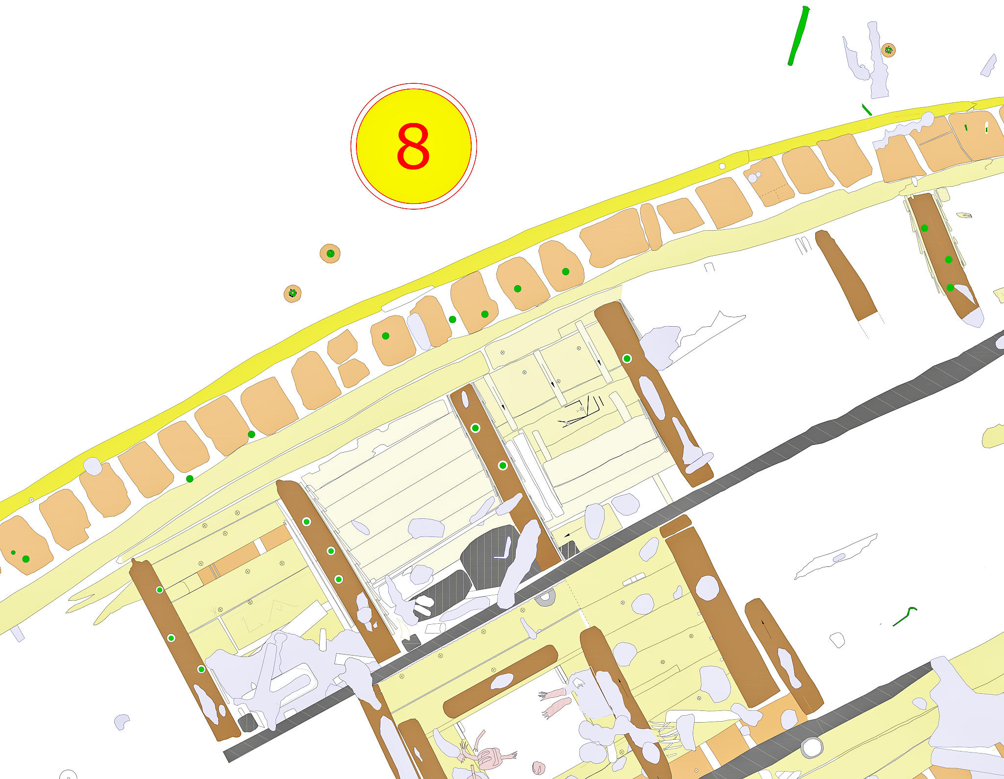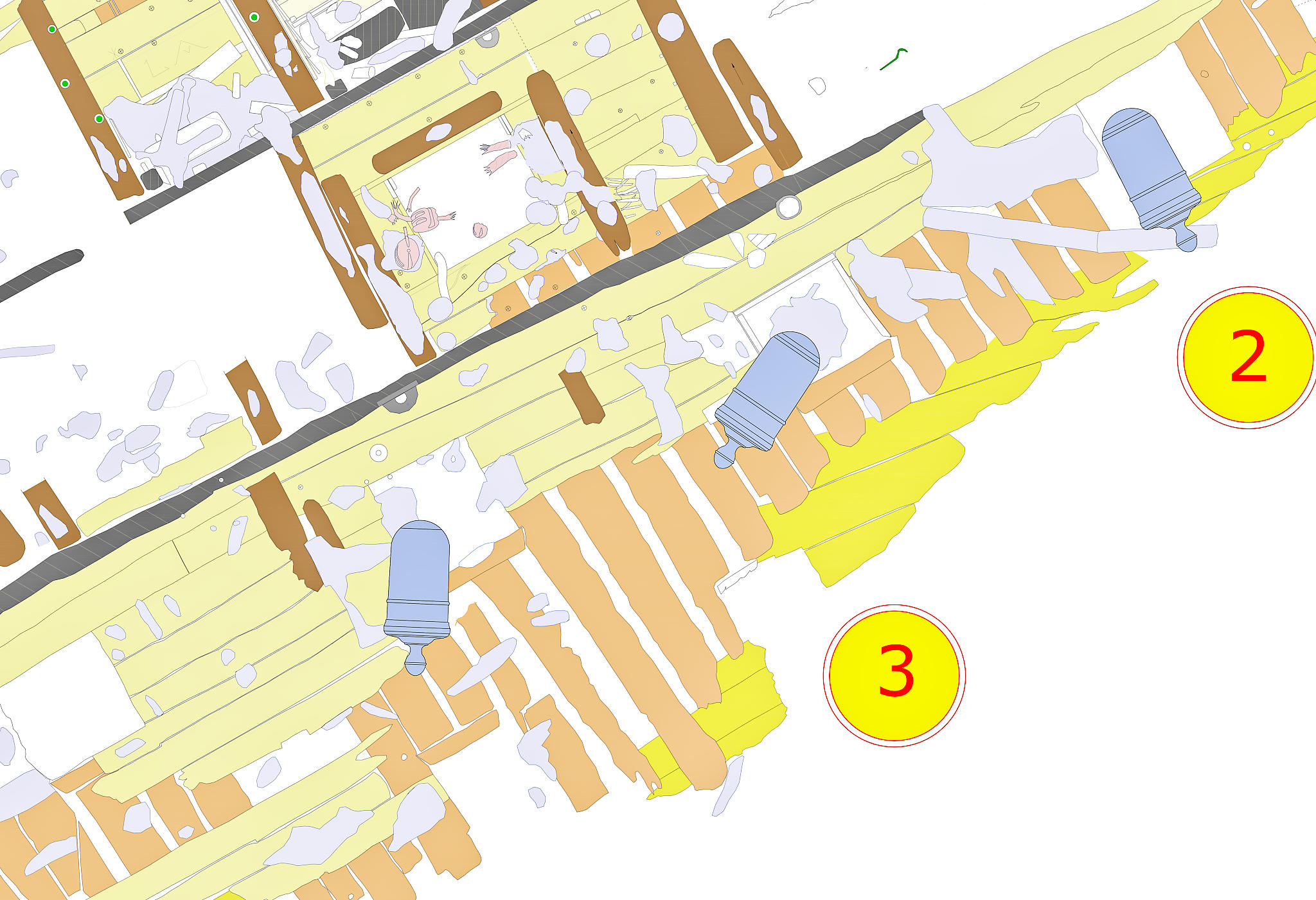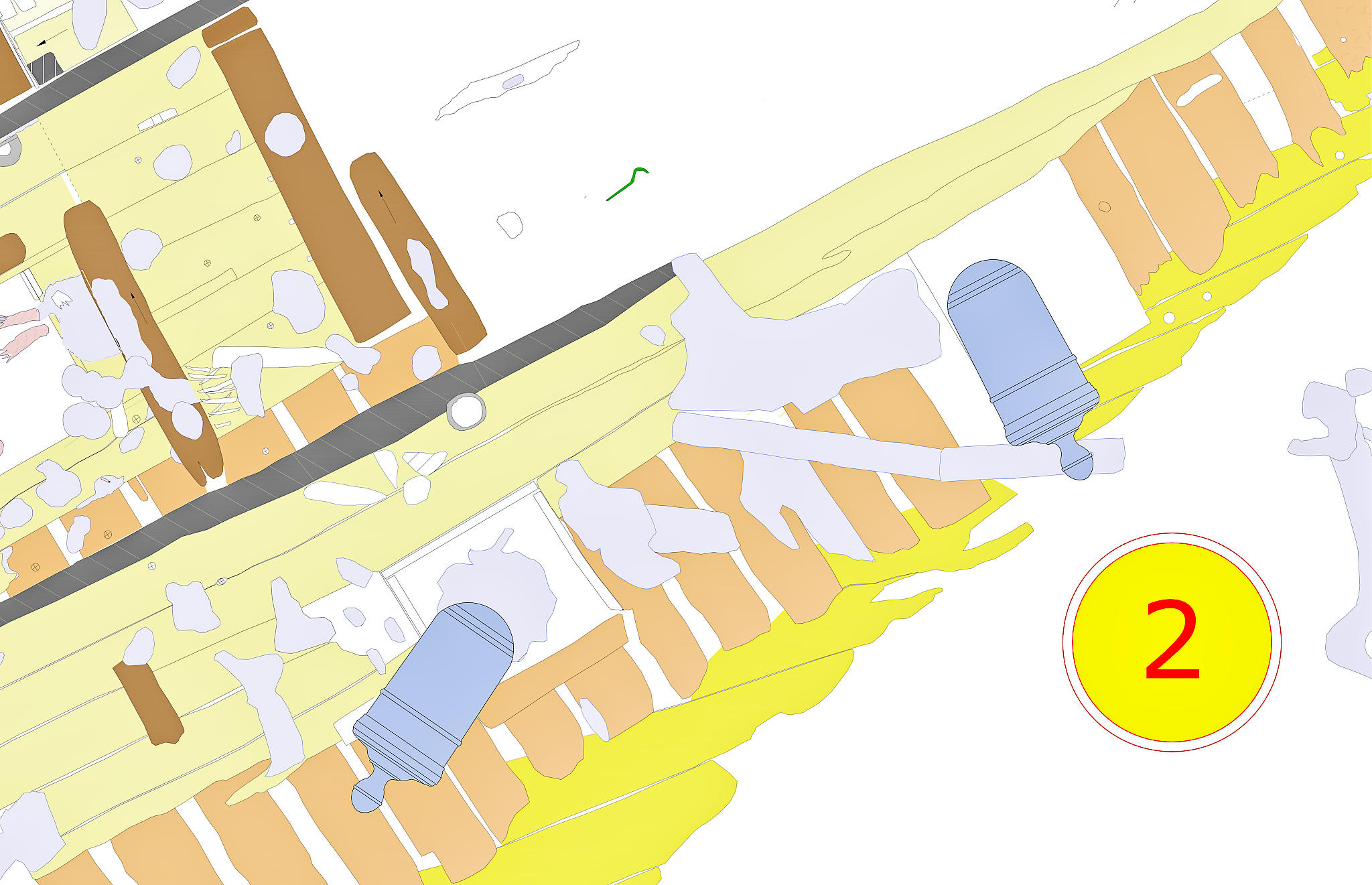 The photograph here shows you roughly what the hull timbers look like at this point (looking east). On the left is the outer hull planking. In the middle, the large square timbers are the frames of the ship. On the right-hand side is the inner planking. If you look carefully, you should be able to see the joins in the planking. Again, you will notice how the timbers are being attacked by wood-boring organisms – sometimes called gribble and shipworm.