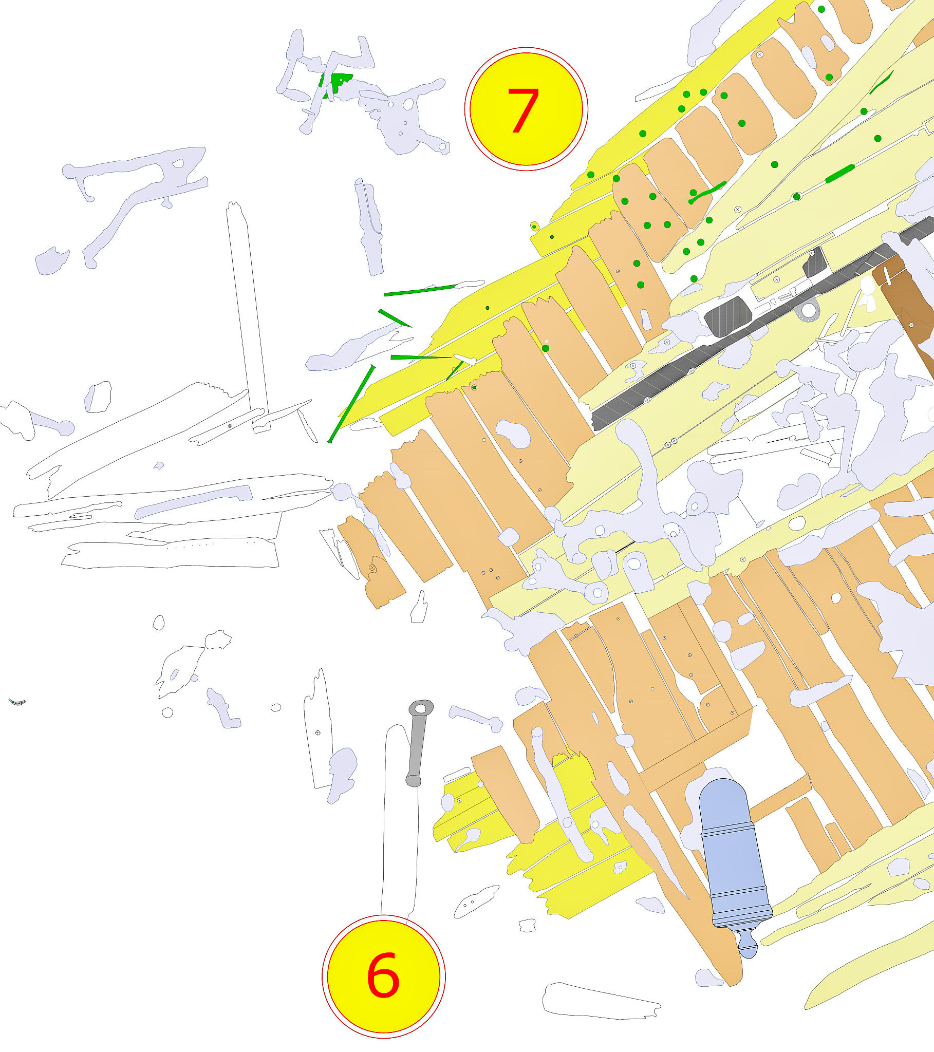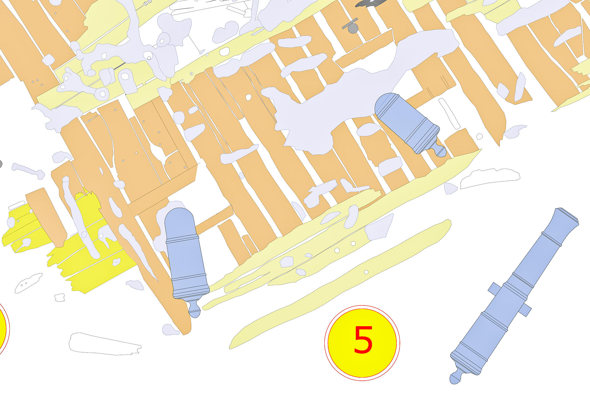 At station 5 you can see one of the eighteen-pound guns lying flat on the seabed. This gun is probably the one which was originally sited at the empty gun port you saw at station 4. Here you can see just how large these guns are. They are 2.75m (9 ft) long and weigh almost two tonnes each. The lower deck guns (thirtytwo-pound) were even larger. We do not know why this gun did not remain within its gunport as the other five eighteen-pounders did.