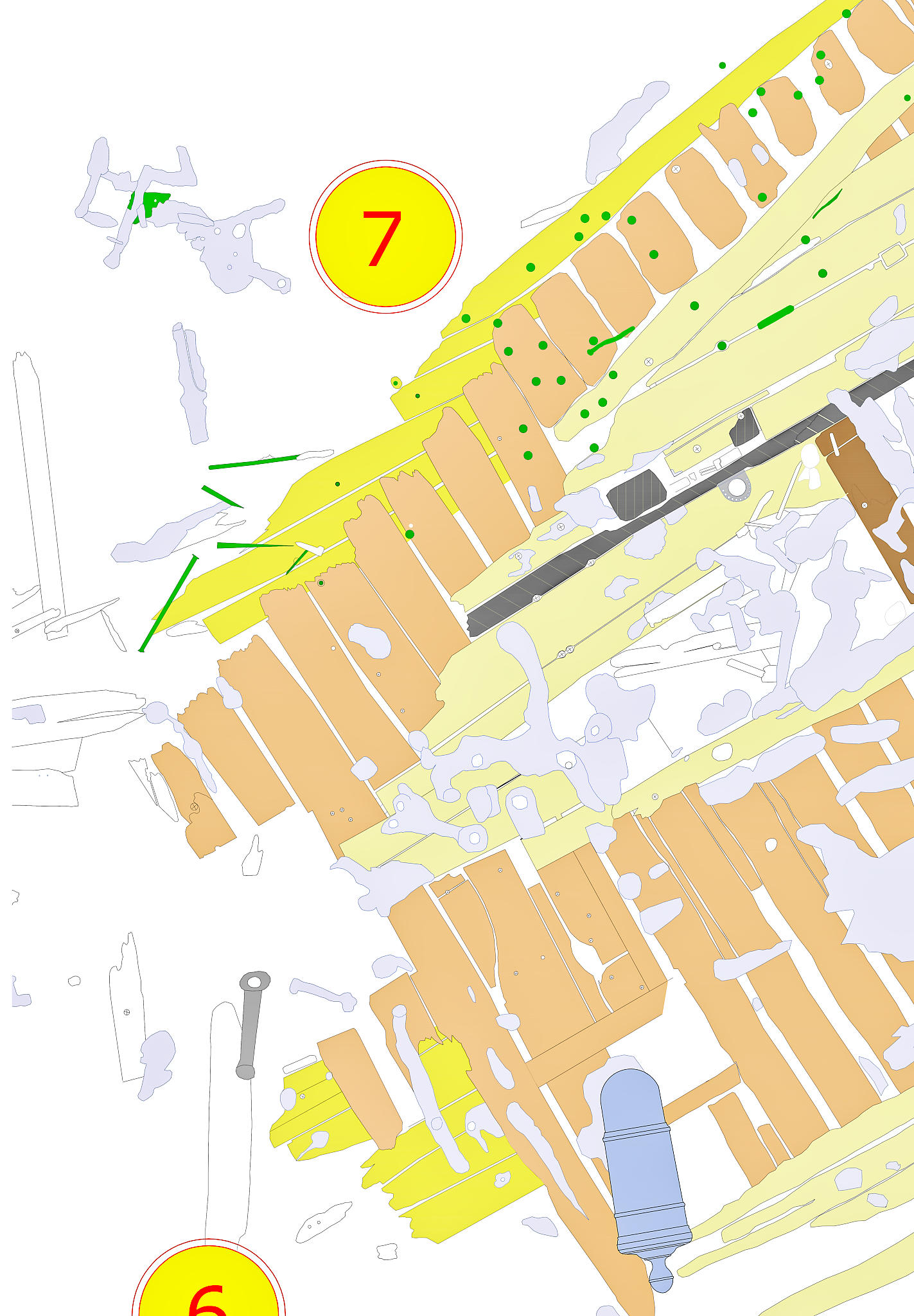 The last of the line of eighteen-pound upper-deck guns lies just to the west of you. Around this gun the inner planking of the ship survives exceptionally well and is worth a closer look.